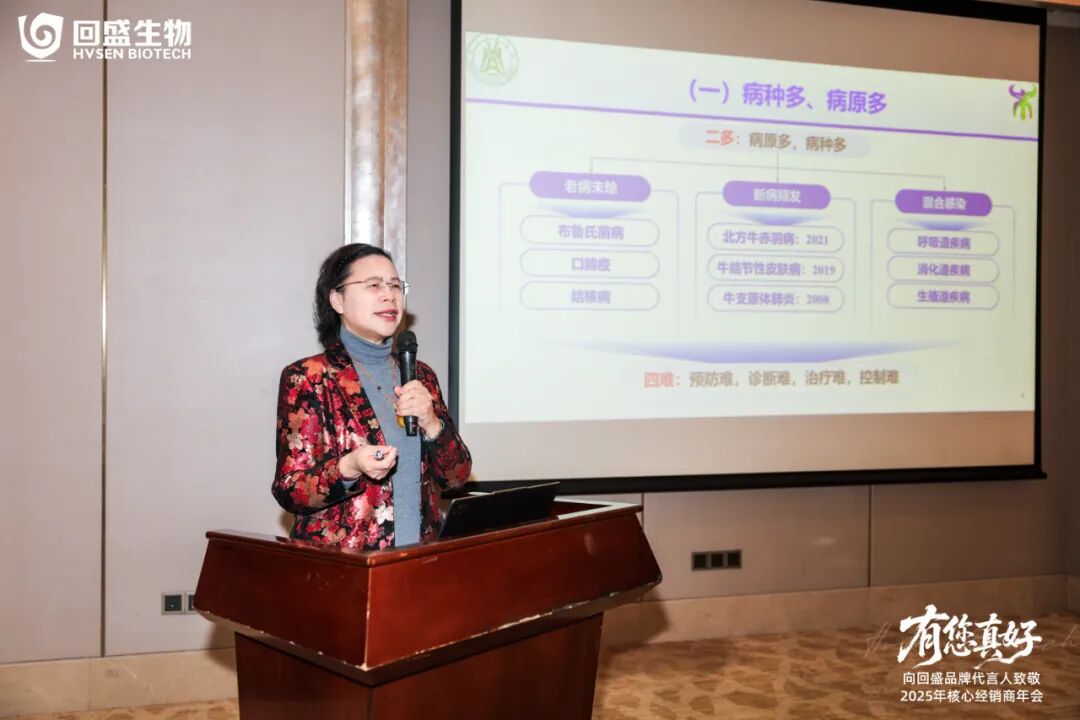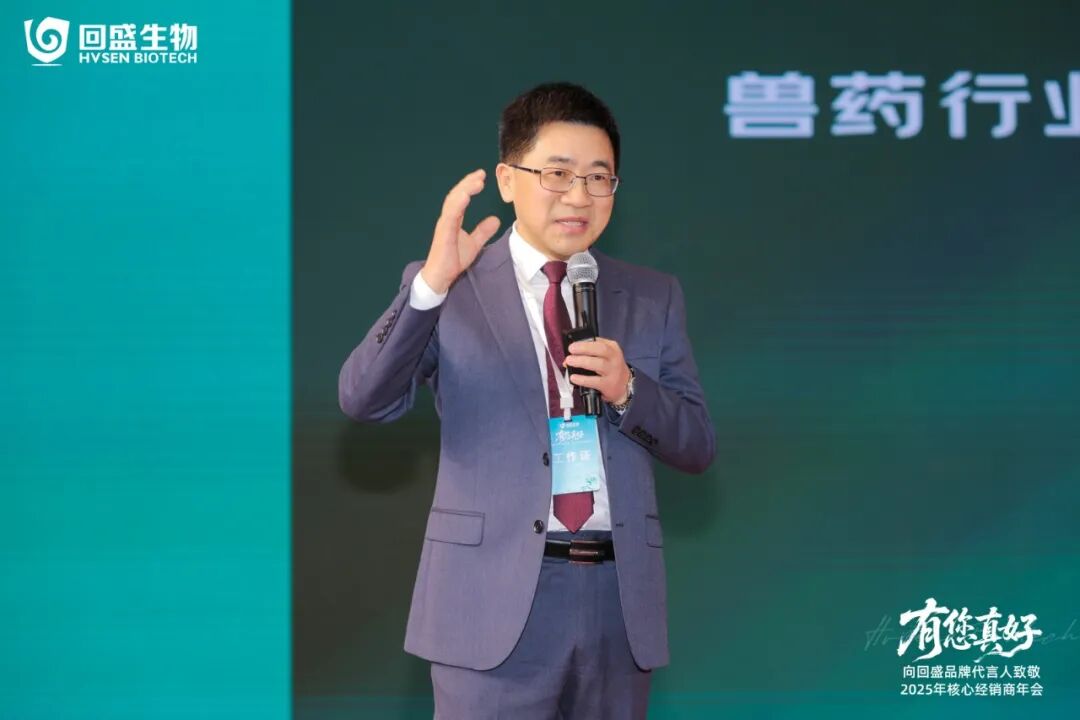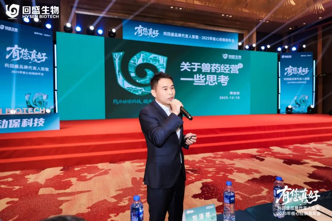 本次会议由回盛生物副总经理黄金斌进行开幕致辞,他表示回盛生物能从一家初创企业成长为今天动保行业的标杆,离不开每一位与回盛同行的品牌代言人,很开心能与大家年末相聚。他提到,未来的竞争是生态圈的竞争,动保行业也正处在全球格局重塑、国内产业升级的关键节点,回盛始终把“赋能伙伴”放在首位,同向发力迎接未来的机遇与挑战。